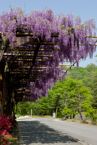 372mにおよぶ回廊に、旧藤岡町の花である藤を4種類(九尺藤・紫三尺・八重黒竜・シロバナ藤)植栽した美しい散策路です。4月下旬から5月上旬にかけて満開期を迎えるために、ゴールデンウィークになると「ふじまつり」が開催され、多くの見物客や観光客で賑わいをみせています。
